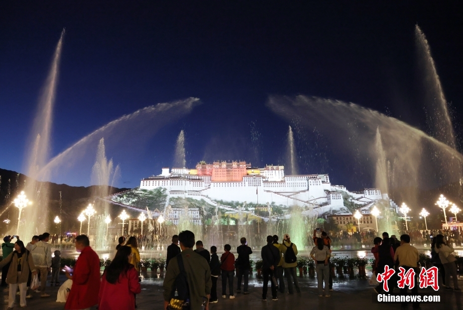 7月7日晚,西藏拉萨布达拉宫广场灯光明亮、喷泉绽放,吸引当地民众与远方游客前来观赏美景。