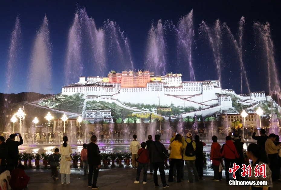 7月7日晚,西藏拉萨布达拉宫广场灯光明亮、喷泉绽放,吸引当地民众与远方游客前来观赏美景。
