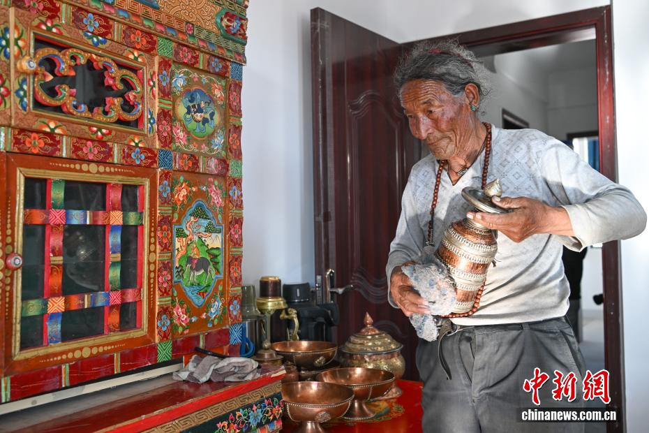 8月15日,定日6.8级地震灾后恢复重建首批民房入住仪式在定日县长所乡森嘎村村民广场举行,截止到8月15日,首批2578户12139人喜气洋洋入住新居,迎来了幸福美好的新生活。图为8月14日,西藏定日县森嘎村村民扎西老人在新房擦拭家具。