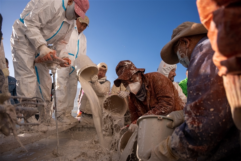 宫墙下,人们排队领取防护服,而后疾步前往涂料搅拌点,生怕去迟了一步,这就是一年一度的布达拉宫粉刷季,现场鲜活又热闹。