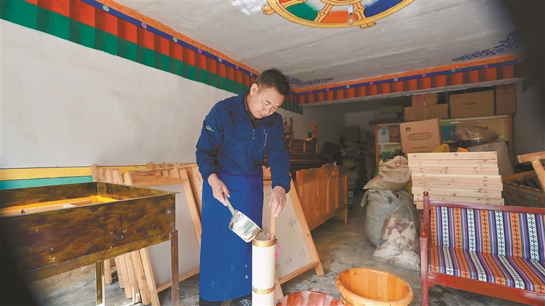 走进墨竹工卡县唐加乡罗杰林民族手工艺品加工专业合作社,记者发现,里面竟别有洞天,摆满了各种颜色的藏纸,有的鲜艳夺目,有的相对淡雅。为了更加美观,部分彩色藏纸上还印有文字和图案。房间的另一边则摆放着由各种颜色的藏纸加工而成的笔记本、笔筒、抽纸盒等种类丰富、款式新颖的工艺品。拉萨市市级非物质文化遗产第五代直贡嘎秀藏纸技艺传承人觉康就啊·阿旺曲央正带领徒弟们调试新研发的藏纸染料——经改良后的藏纸呈现出细腻的皮质质感,兼具传统韵味与现代审美,让这门拥有近千年历史的非遗技艺,在守护与创新中点亮了当地群众的增收路。