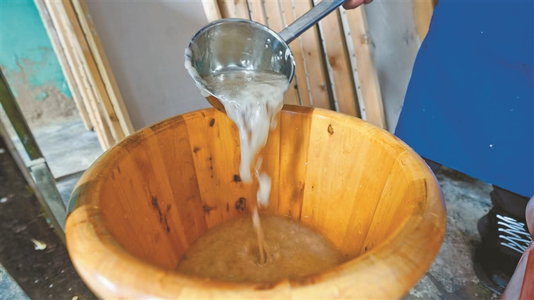 图为阿旺曲央在搅拌原料,制备纸浆。