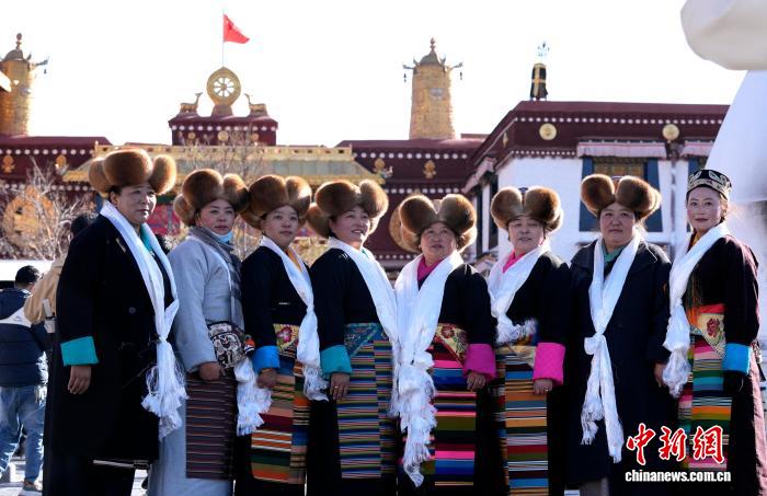 图为拉萨妇女盛装在大昭寺广场合影。中新社记者 李林 摄