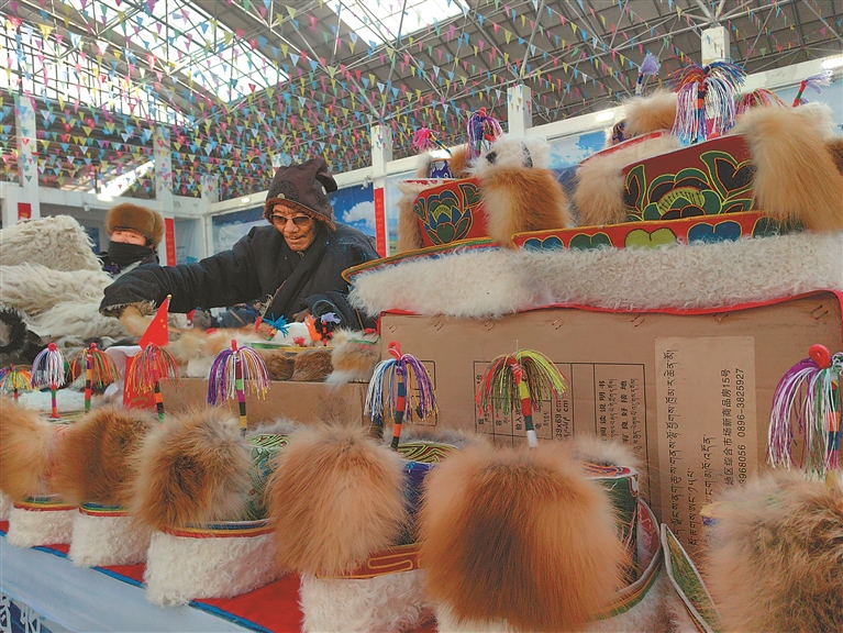 图为那曲市安多县牧民在整理销售天线帽工艺品。记者 赵书彬 摄