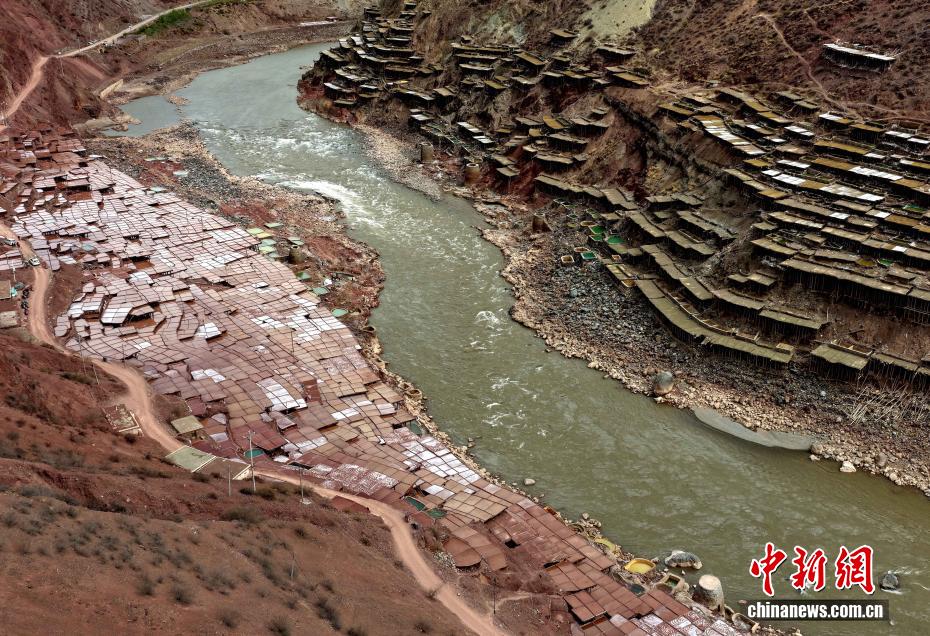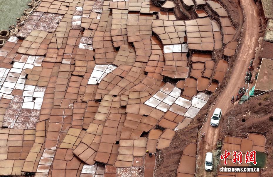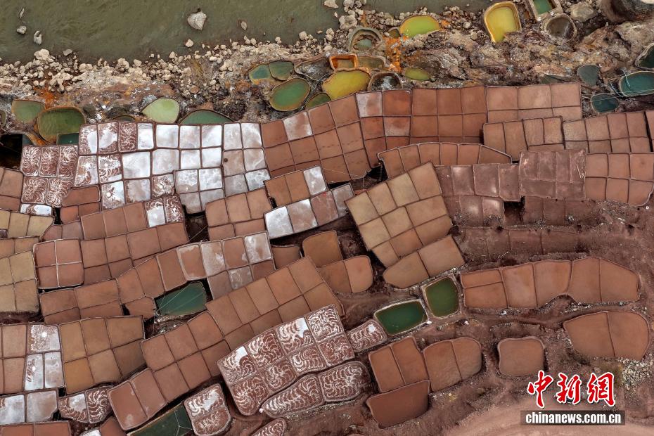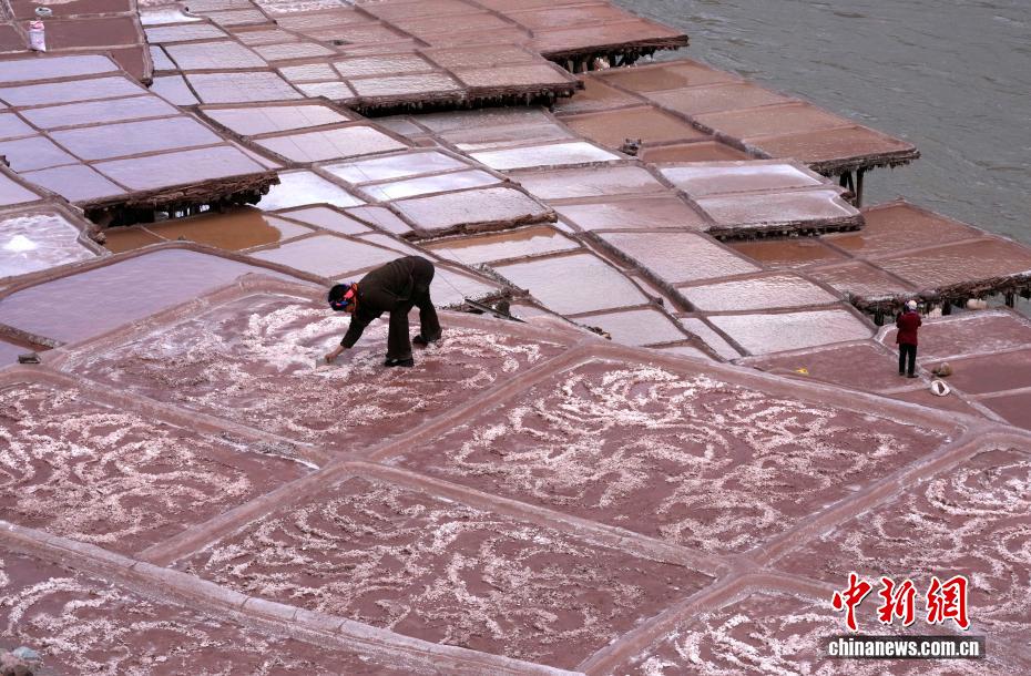 3月24日,西藏昌都市芒康县境内的千年古盐田犹如大地艺术画卷。澜沧江畔,数千块盐田错落分布两岸。当地民众遵循古老传统,引水晒盐,距今已有1300多年的历史。图为当地民众在盐田劳作。中新社记者 李林 摄