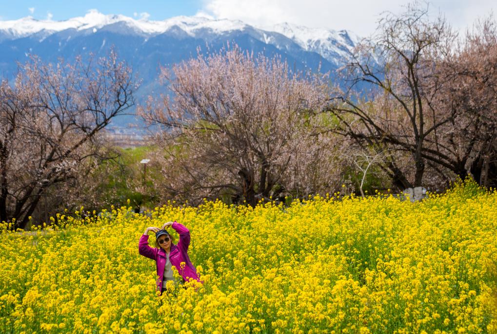 2026年4月2日,游客在林芝市巴宜区嘎拉村拍照留念。新华社记者 丁增尼达 摄