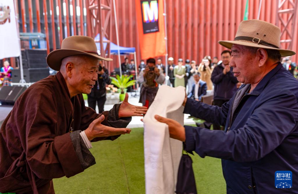 5月18日,友人为吴雨初(左)献上哈达。新华社记者 姜帆 摄