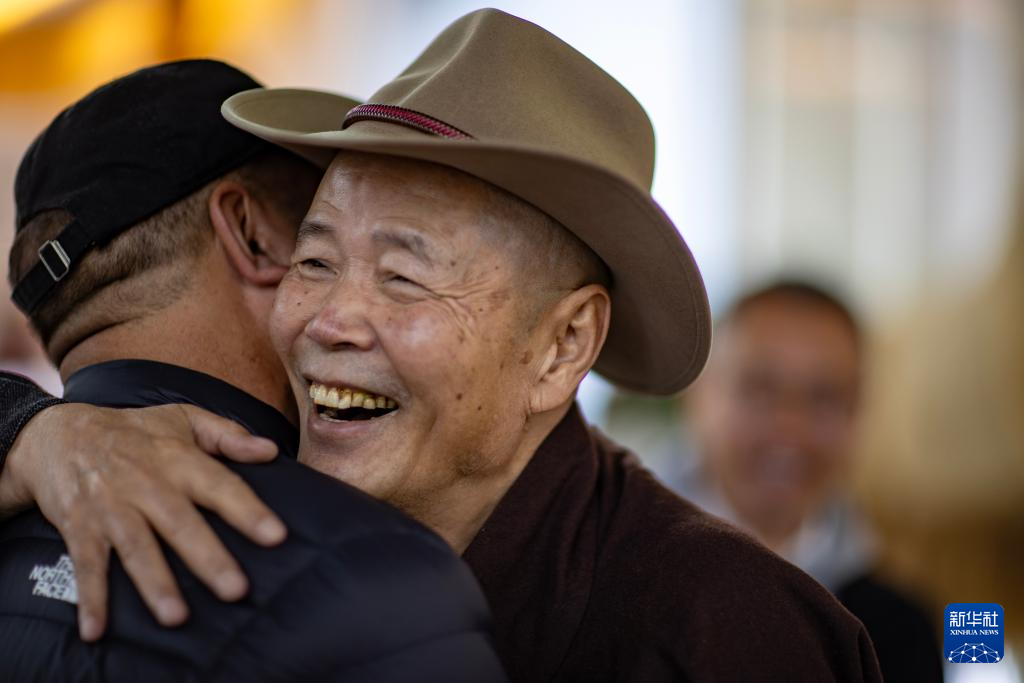 5月18日,吴雨初在西藏牦牛博物馆与友人拥抱。新华社记者 姜帆 摄