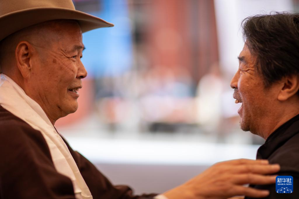 5月18日,吴雨初(左)在西藏牦牛博物馆与友人交谈。新华社记者 姜帆 摄