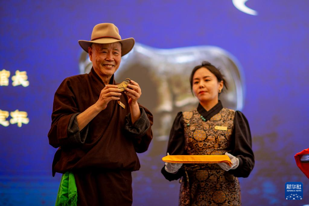 5月18日,吴雨初(左)在西藏牦牛博物馆捐献自己珍藏的铜牦牛文物。新华社记者 姜帆 摄