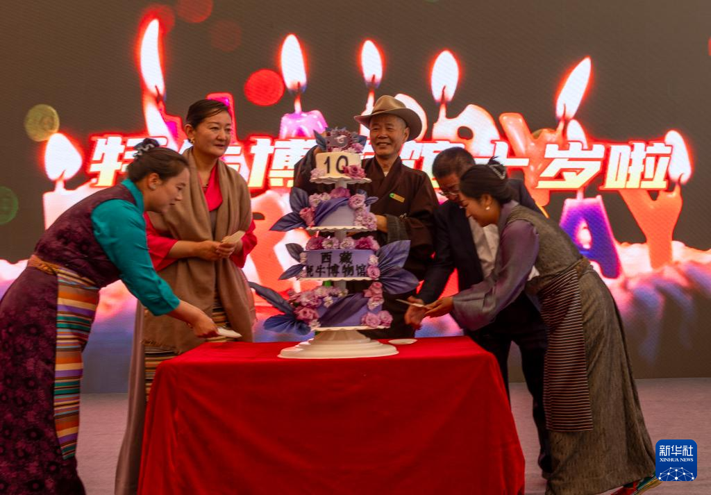 5月18日,吴雨初(左三)为西藏牦牛博物馆切生日蛋糕。新华社记者 姜帆 摄