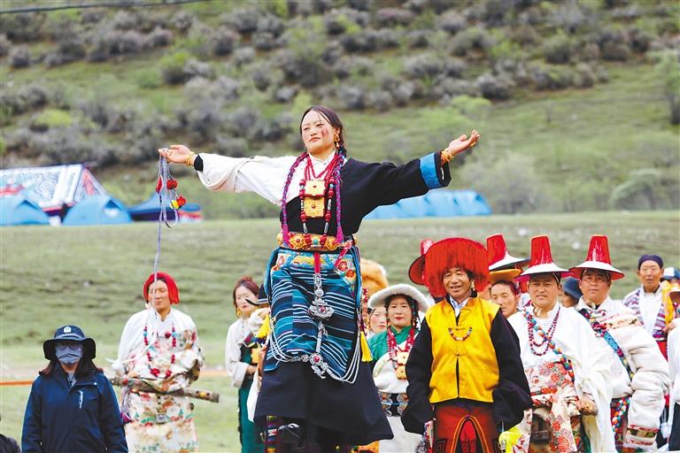 开幕式在藏雄村幼儿园小朋友表演的舞蹈《第一支花》中拉开序幕,唐古乡、阿朗乡、旁多乡对北部三乡独特的文化艺术、生态环境以及丰富的“非遗”文化进行展示与推介,还有特色服饰展演,他们将秀场搬到大自然,以“传统民族服饰走秀+‘非遗’文化展示+牧区生活用具展示”为核心,配以林周县唐古乡关于北部三乡服饰的唱颂词与鼓点相融合,为展演提供了独特的音乐伴奏,展现了林周县北部三乡丰富的民族文化。