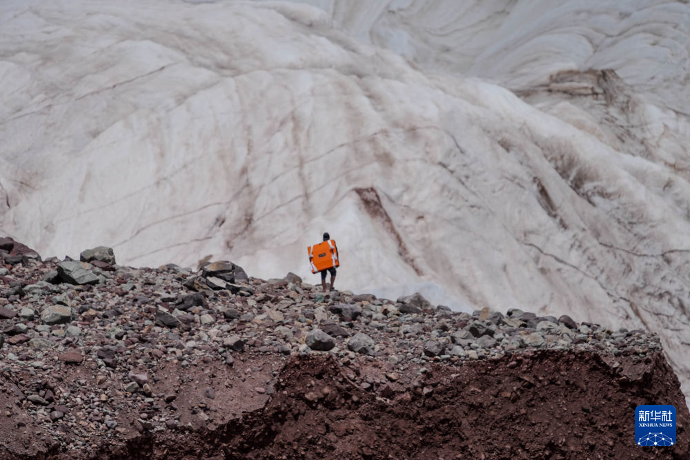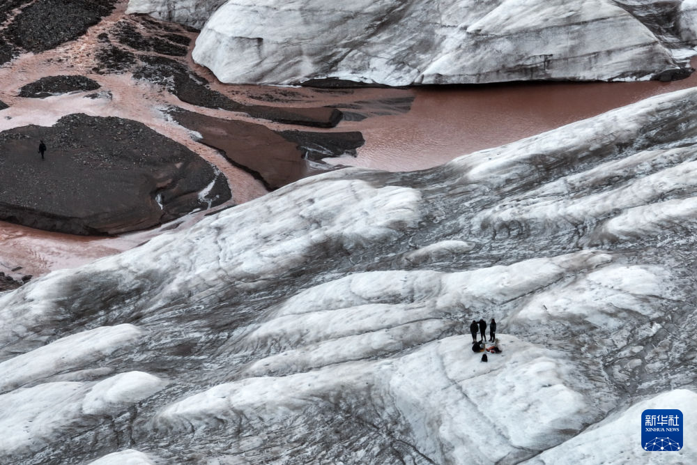 7月25日,在冬克玛底冰川,科考队员在探测冰川(无人机照片)。新华社记者 伍志尊 摄