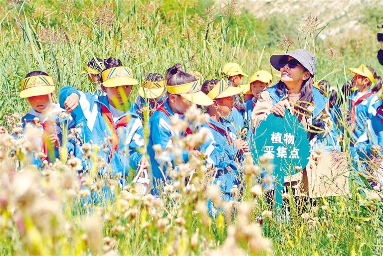 图为8月15日,专业老师带领小学生们在拉鲁湿地观察、采集植物样品。 记者 格桑伦珠 摄