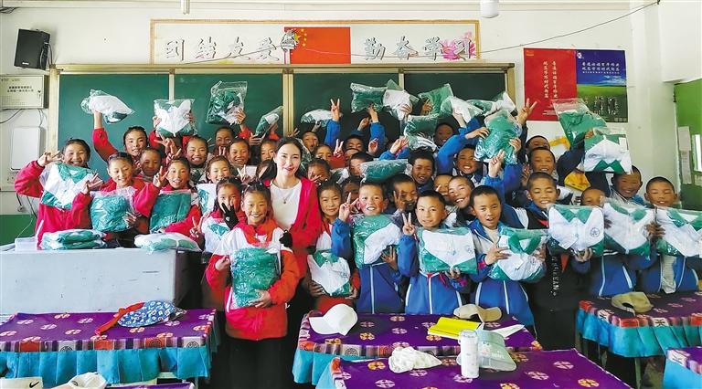 2014年至今,日喀则市南木林县党员扎西拉姆积极投身慈善事业,用无私奉献诠释着邻里守望相助和民族团结的真谛。 图为扎西拉姆(中)与受助孩子合影。