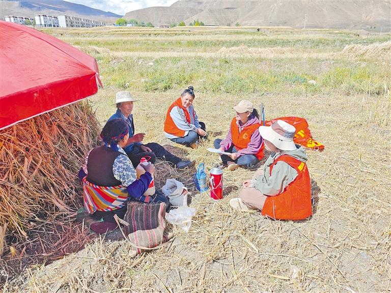 图为民族团结进步宣传活动月期间,萨迦县志愿者在田间向群众宣讲民族团结相关知识。