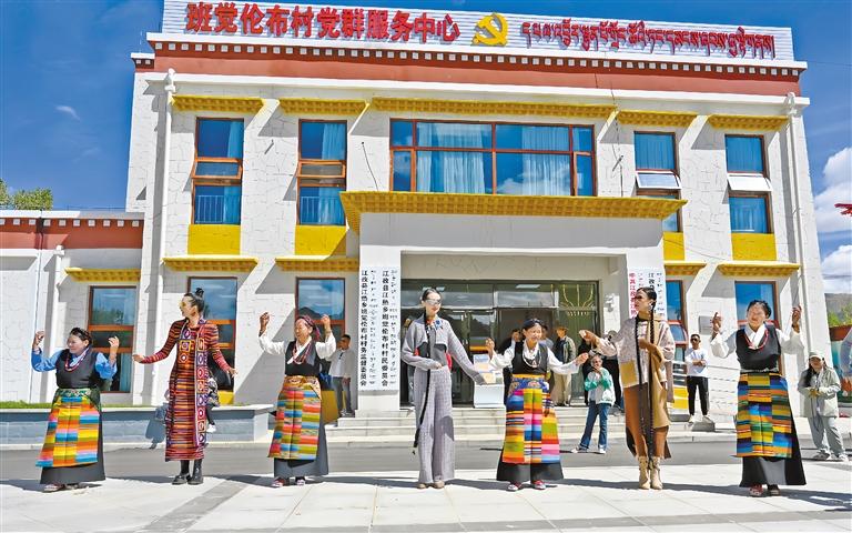 图为9月,在日喀则市江孜县江热乡班觉伦布村举办的西藏氆氇系列发布秀结束后,群众齐跳锅庄,跳出民族团结“同心圆”。