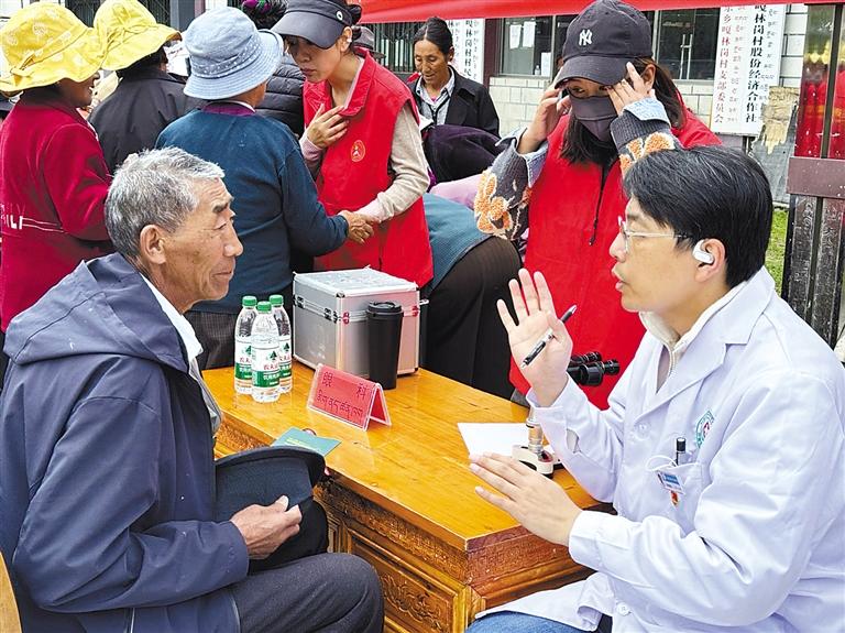 近年来,“组团式”援藏医疗人才与日喀则各族人民群众结下了深情厚谊。 图为上海市“组团式”援藏医疗队在日喀则市亚东县上亚东乡开展义诊活动。