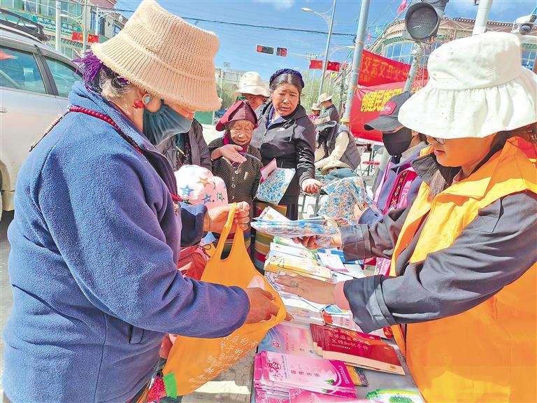 图为萨迦县民族团结进步宣传活动月启动仪式上,工作人员发放宣传册。
