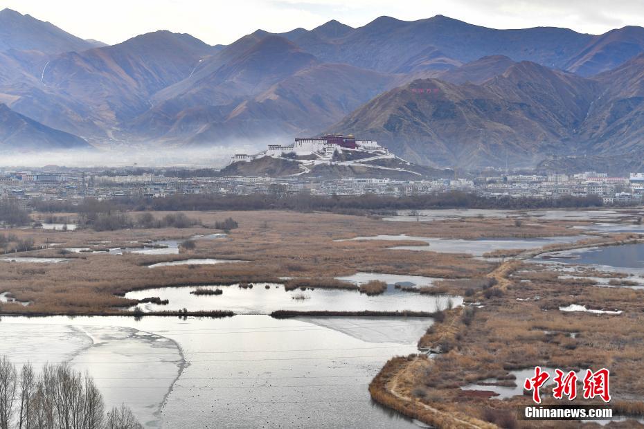 12月29日,冬日早晨,拉萨美如画。拉萨河被晨光染成金色,河水静静流淌。西藏自治区拉萨市的拉鲁湿地国家级自然保护区内,候鸟欢快,忙着觅食、嬉戏。远处,布达拉宫与拉鲁湿地相互映衬,构成了一幅绝美画卷。图为12月29日,拉鲁湿地景色。