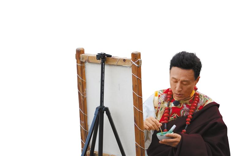中央广播电视总台“乘着大巴看中国·西藏行”的嘉宾在嘎玛乡体验唐卡绘画。记者 贡秋曲措 摄