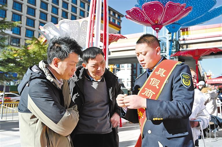 图为桑珠孜区市场监管局投诉举报中心负责人李良友(右)向市民讲解商品真假辨别方法。记者 扎西顿珠 摄