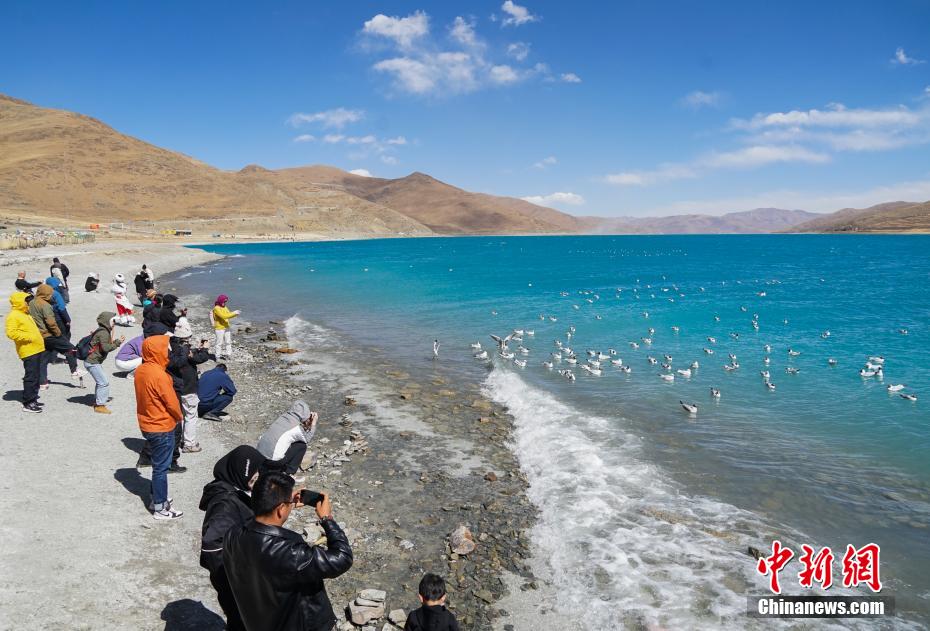 3月31日,游客在羊卓雍措游览。羊卓雍措位于西藏自治区山南市境内,是喜马拉雅山北麓最大的内陆湖泊,湖面海拔4440多米。春日,湖水与蓝天、白云、群山相互映衬,成群的水鸟振翅飞翔,构成一幅壮丽的生态画卷。