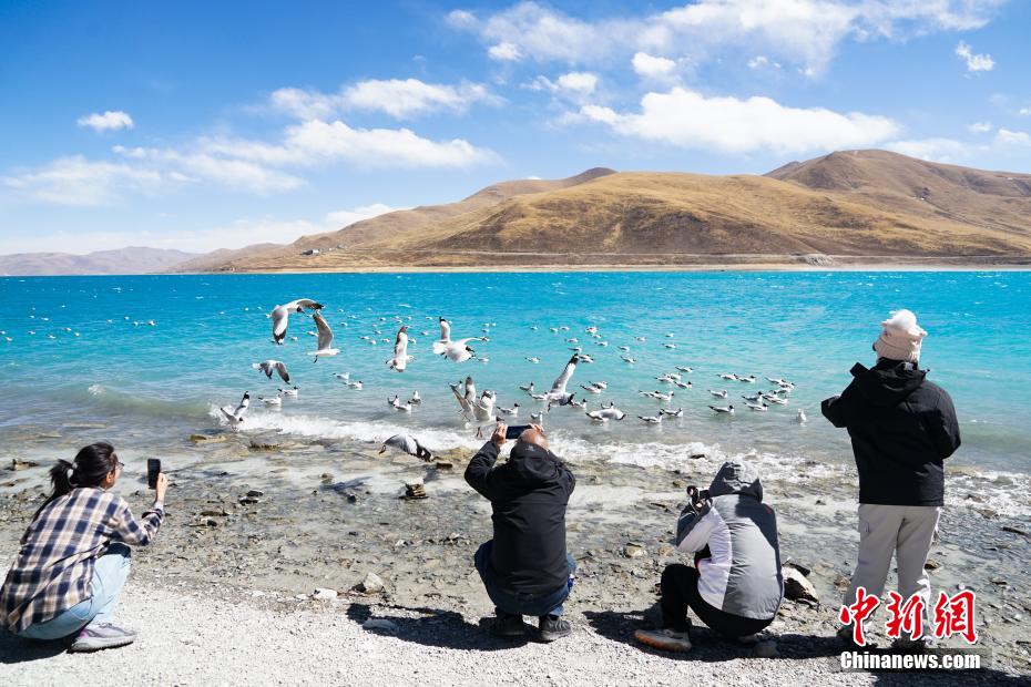 3月31日,游客在羊卓雍措游览。羊卓雍措位于西藏自治区山南市境内,是喜马拉雅山北麓最大的内陆湖泊,湖面海拔4440多米。春日,湖水与蓝天、白云、群山相互映衬,成群的水鸟振翅飞翔,构成一幅壮丽的生态画卷。