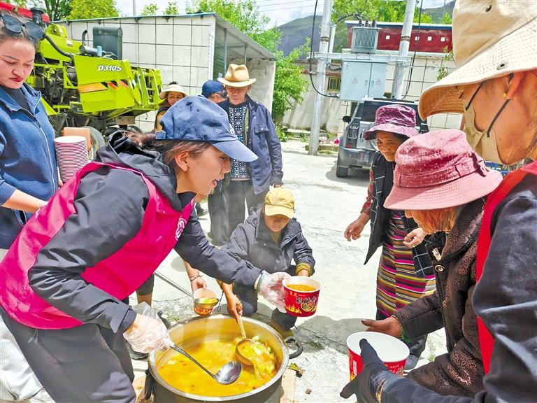 夏日的雅鲁藏布江中游,碧水如缎,潺潺流水轻吻着岸边碎石。位于江畔的山南市加查县拉绥乡棍追巴村委会小院里,铁锅支在土灶上“咕嘟咕嘟”地冒着热气,乳白的牛肉汤翻滚着,大块的牛腩在汤中浮沉,胡萝卜丝、土豆块吸饱了汤汁,胀鼓鼓地透着香甜。