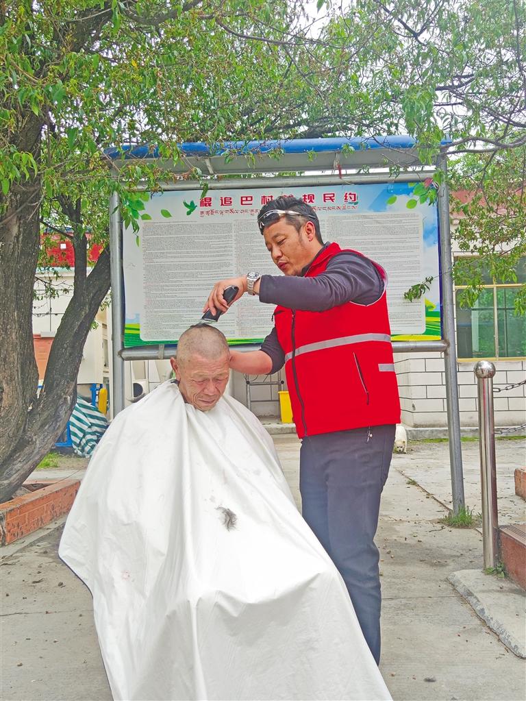 “次仁啦,夏天来了,天气开始热了,我把你的头发修短点好不好?”在电推子的嗡嗡声停止后,75岁的次仁边照着镜子边摸着自己的头说:“十分感谢,感觉我年轻了二十岁哟!”理完发的小朋友巴桑,蹦跳着跑到小伙伴跟前:“快看我的新发型,像不像解放军叔叔?”