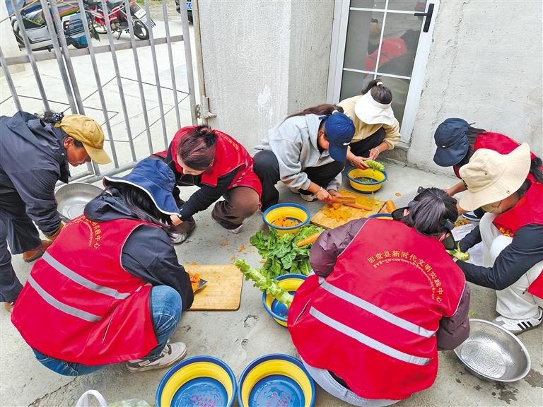 在村委会小院里,87岁的阿古老人舀起一勺牛肉汤吹了吹,吸溜一口咽进肚后赞叹道:“嗯!这汤比我儿子炖得还鲜美。”小孩们捧着西瓜啃得满脸汁水,4岁的小扎西举着啃成月牙形状的瓜皮,开心地向奶奶展示着。