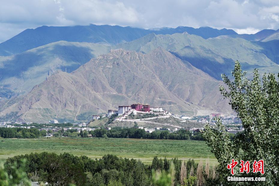 7月16日,从西藏拉萨拉鲁湿地远眺布达拉宫和南山。据了解,拉萨南北山绿化工程于2021年启动,东起墨竹工卡县尼玛江热乡,西至曲水县茶巴拉乡,东西绵延近200公里,计划完成国土绿化面积206.72万亩,助力拉萨成为生态宜居的高原首府城市。中新社记者 张祥毅 摄