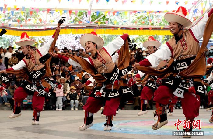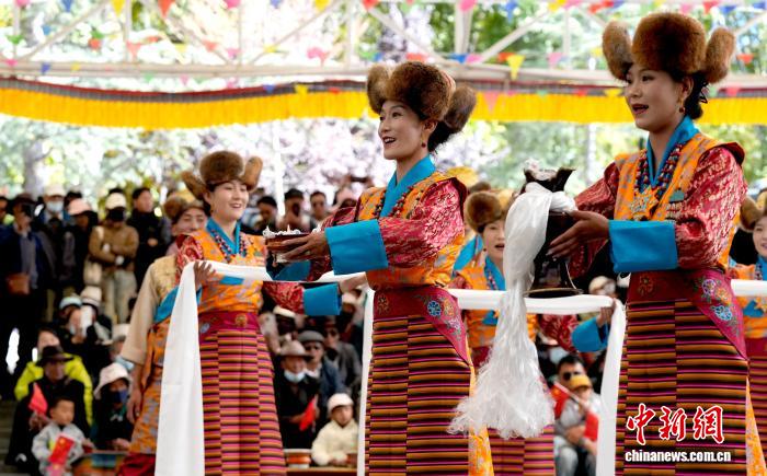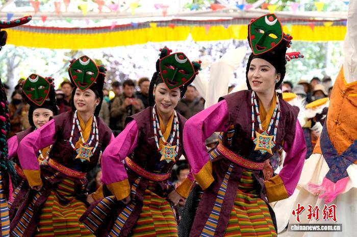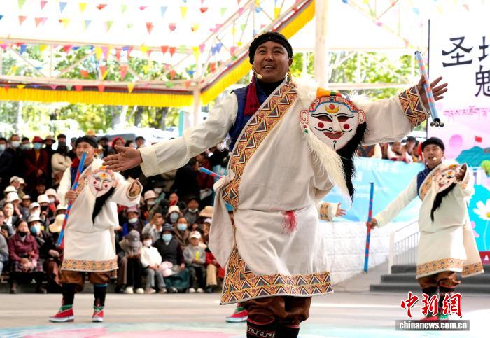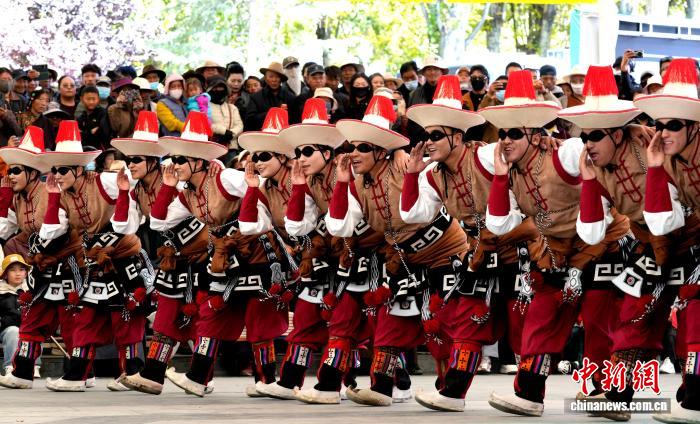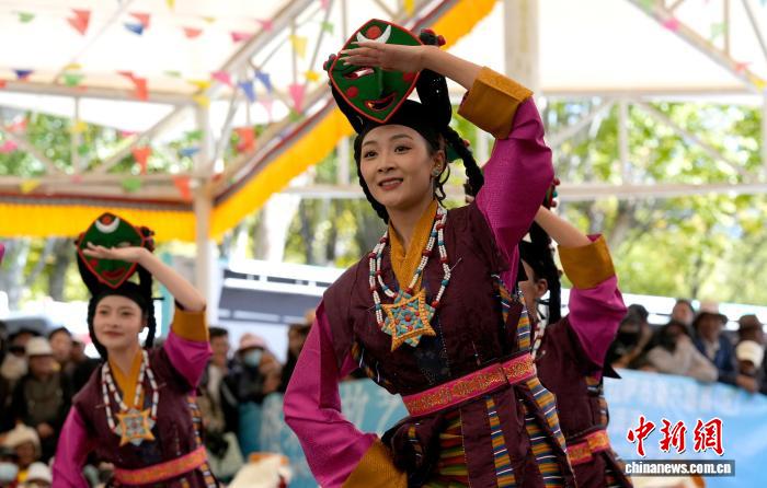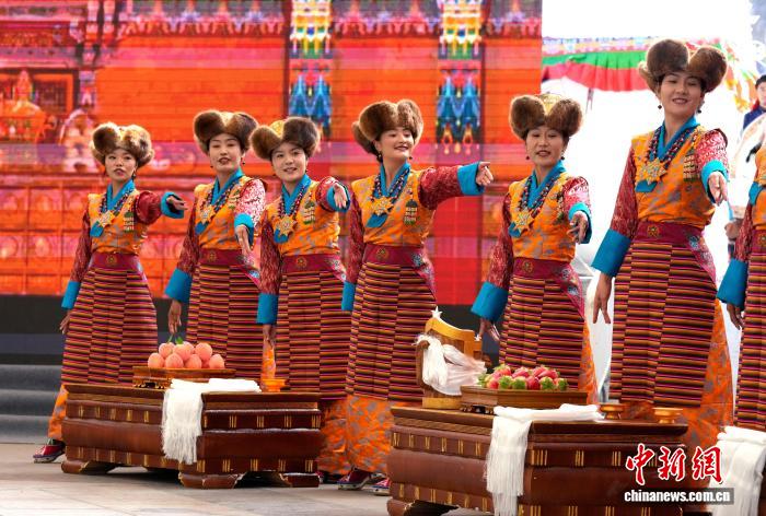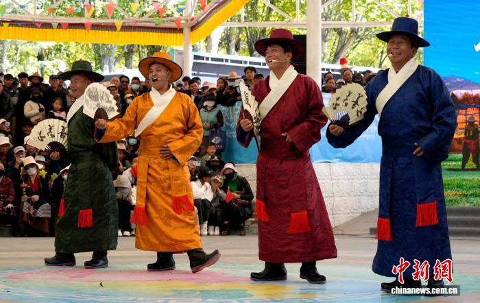 10月19日,“格桑花杯”拉萨市第六届县(区)艺术团文艺调演颁奖活动在布达拉宫脚下的宗角禄康公园举行。现场,拉萨市各县(区)艺术团带来精彩节目。图为文艺调演颁奖活动上的文艺表演。中新社记者 李林 摄