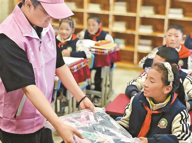 志愿者为孩子们分发小奖品。记者 鹿丽娟 通讯员 格桑央珍 摄影报道