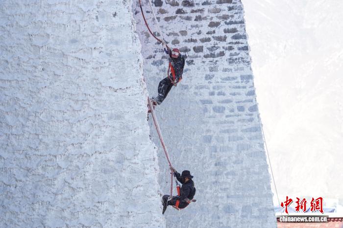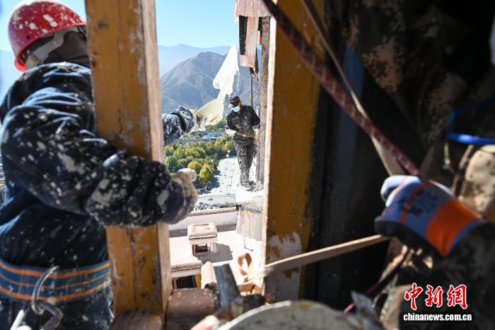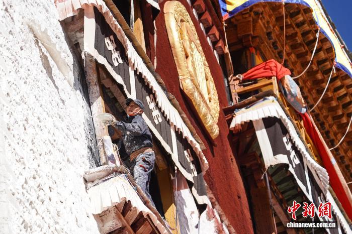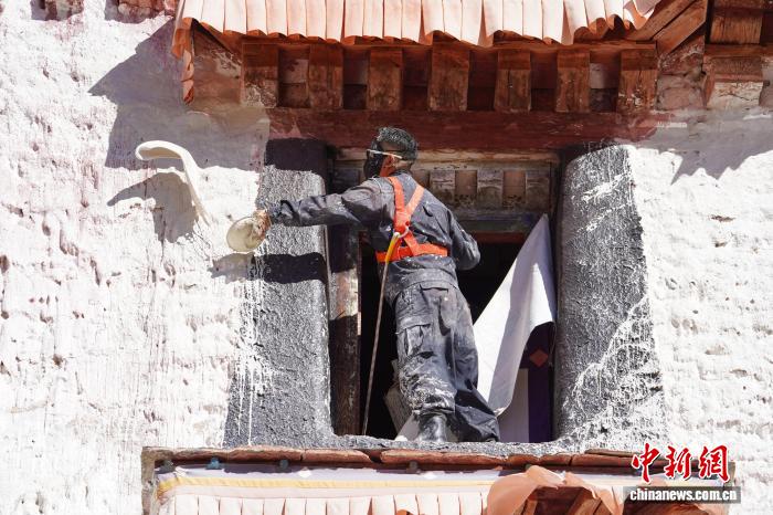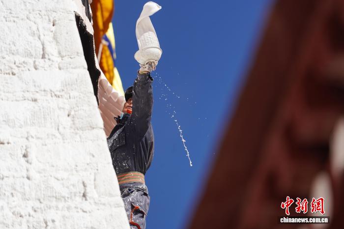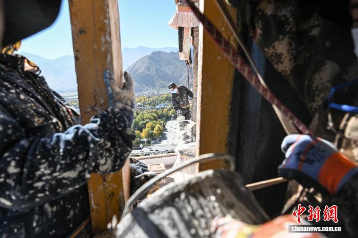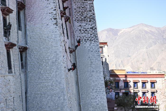 10月22日,西藏拉萨,布达拉宫管理处的工作人员和拉萨信众自发参与其中对宫墙、窗框进行整体粉刷,为布达拉宫“年度美容”。当日,布达拉宫迎来了一年一度的粉刷季。图为工作人员对布达拉宫外墙喷洒涂料。中新社记者 贡嘎来松 摄