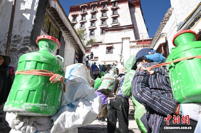 10月22日,西藏拉萨,布达拉宫管理处的工作人员和拉萨信众自发参与其中对宫墙、窗框进行整体粉刷,为布达拉宫“年度美容”。当日,布达拉宫迎来了一年一度的粉刷季。图为拉萨信众排队搬运布达拉宫粉刷使用的涂料。中新社记者 贡嘎来松 摄