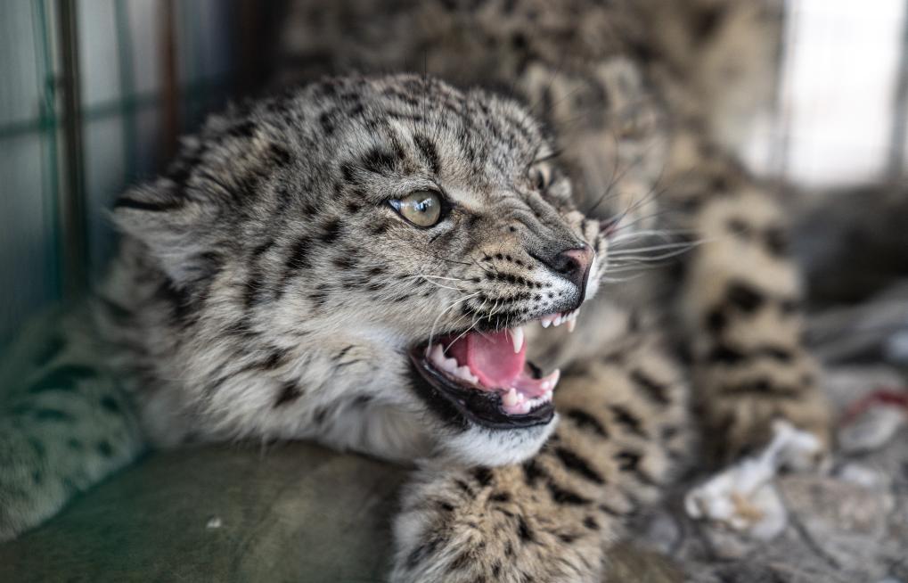 2024年5月13日,两只雪豹在西藏自治区那曲市尼玛县被野生动物管护队员放归自然。这是放归前拍摄的其中一只雪豹(2024年5月13日摄)。