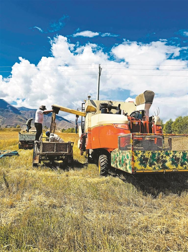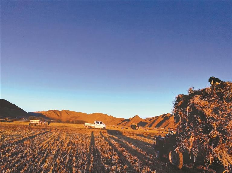 当纳金山的风裹着第一缕凉意掠过山脊,林周的秋便顺着拉萨河的支流漫开,将整片土地染成鎏金模样。恰拉山脚下,澎波河谷的青稞田率先换上金装,沉甸甸的穗子在风中轻轻摇曳,把阳光揉碎成满田的碎金,空气中弥漫着谷物成熟的清香;松盘乡的田埂上,农人弯腰收割的身影与悠闲啃食的牦牛相映成趣,堆起的青稞草垛错落分布,为这幅金色画卷添上生动注脚;江热夏乡的村落旁,杨树叶簌簌飘落,铺在石板路上像一层柔软的绒毯,连屋顶的风马旗都似被秋阳镀了暖光,每一处角落都浸着丰收的温柔。正如拉萨市民泽仁所说,林周的秋天就像一幅丰富多彩的油画,牦牛、田野与村庄,都呈现出独有的色彩与气氛。
