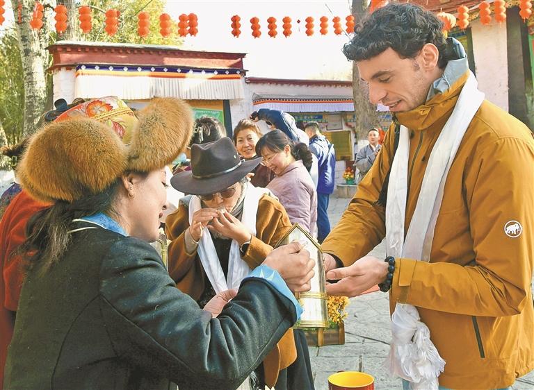 近日,在罗布林卡景区,中外游客共品青稞美酒,感受民俗风情。记者 王敏 摄