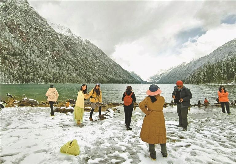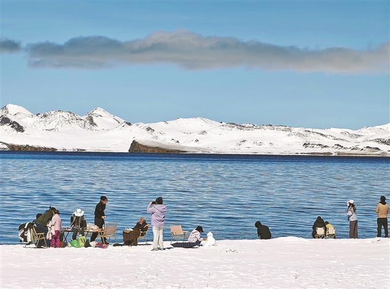 林芝市工布江达县新错湖畔,游客在雪景中打卡留念,尽享高原湖光山色。记者 次仁平措 摄