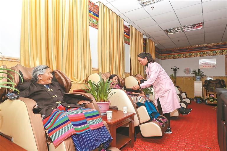 图为阿里地区双集中供养中心里,老人们在保健理疗室进行按摩保健。记者 格桑吉美 摄(资料图片)
