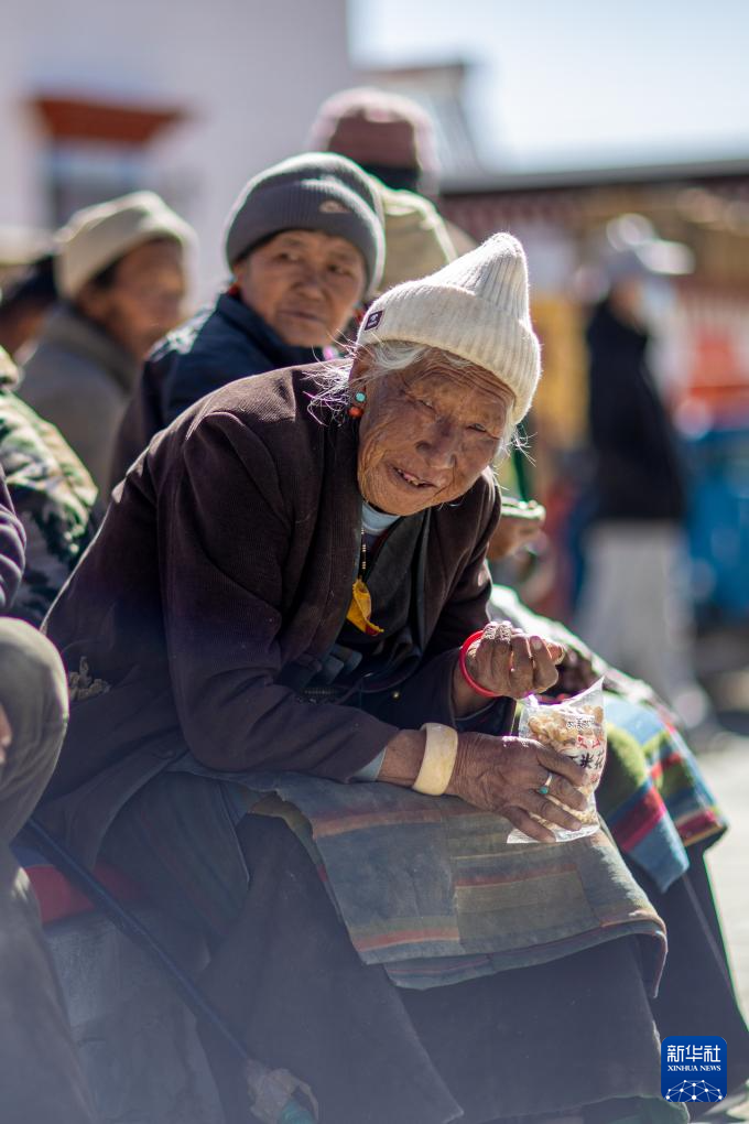 1月5日,在森嘎村村史馆前的广场上,老人晒着太阳吃着零食。新华社记者 姜帆 摄