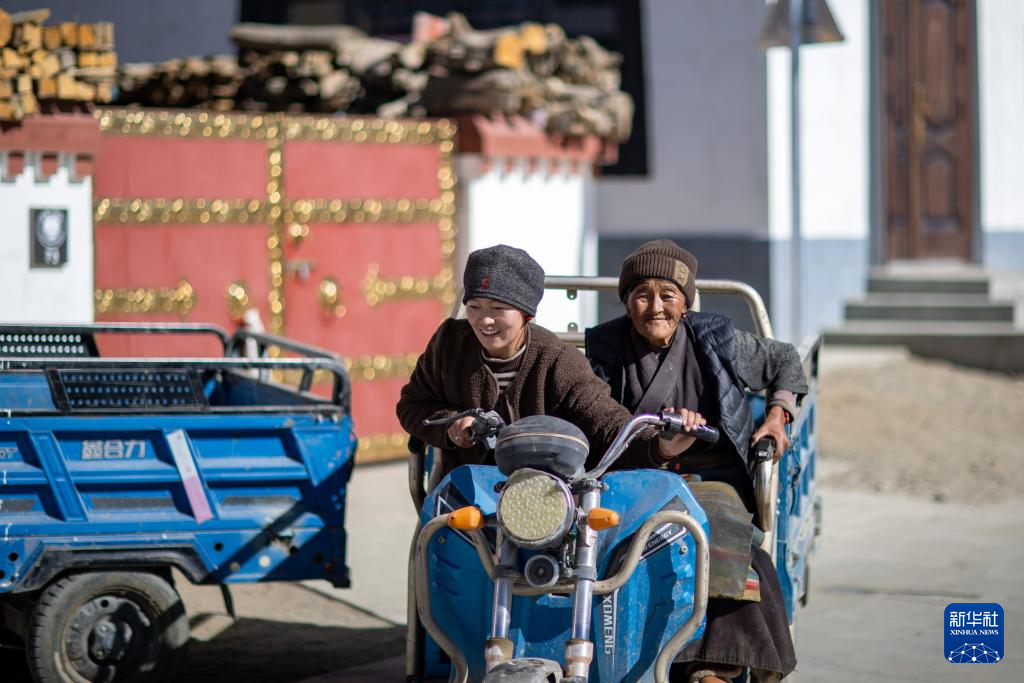 1月5日,定日县长所乡森嘎村村民面带笑容,骑三轮车出行。新华社记者 姜帆 摄