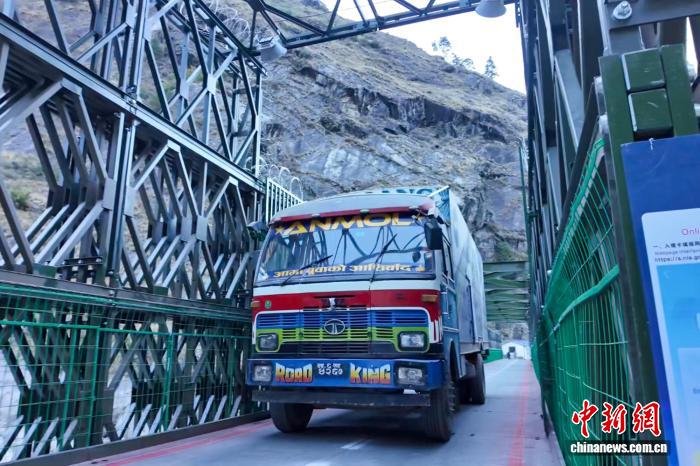 2026年1月1日上午,尼泊尔货柜车经吉隆热索临时便桥驶入西藏自治区日喀则市吉隆口岸。(吉隆县融媒体中心供图)