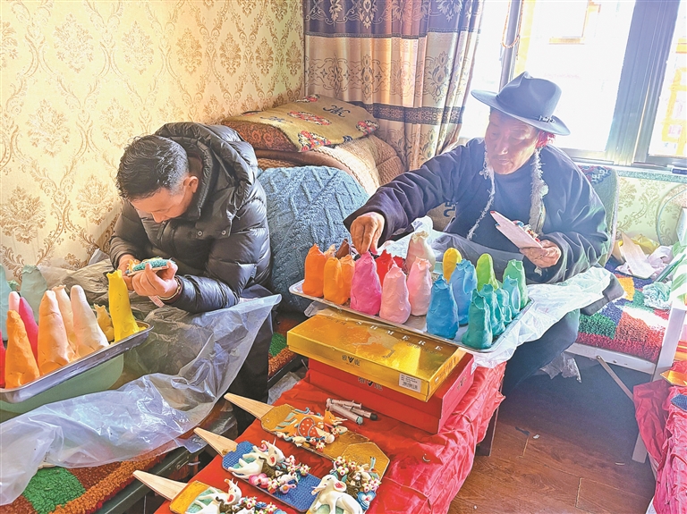 多年来,罗布累计培养了400多名学徒。每年藏历新年前,他都会组织为期一个月的集中培训,之后带着大家到拉萨共同参与酥油花创作。不少学徒学成后技艺精湛,靠着这门手艺站稳了脚跟。如今,酥油花制作已成为当地村集体经济发展的重要支柱,更是改善群众生活的主要收入来源,村里不少家庭全家参与制作,人人都是技艺传承人。