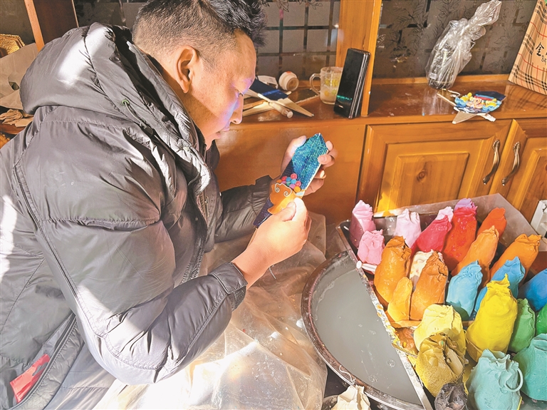 酥油花制作工序精细、容不得半点马虎,罗布的徒弟次仁便是在长期打磨与摸索中逐步出师。磋磨、揉捻、塑形、构图,每一个环节都至关重要。午后的光影透进屋内,次仁手上的动作却没有丝毫停歇。天气寒冷,制作酥油花需要反复将双手浸入冰水中塑形,刺骨的凉意丝毫没有冲淡他对这门技艺的热忱。