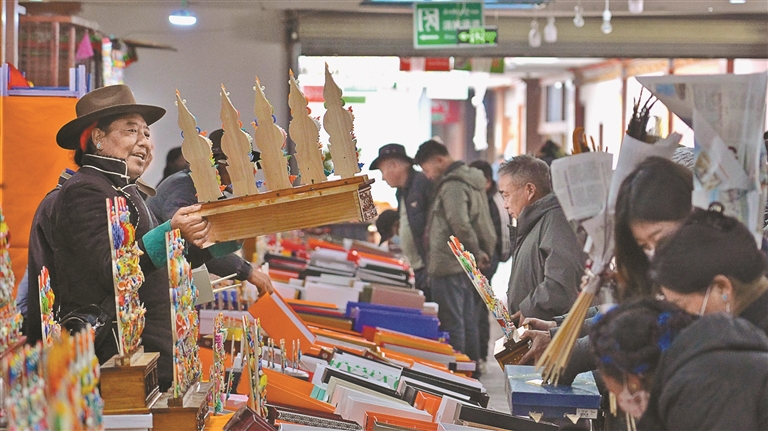 在拉萨八廓商城,“仁布亚德酥油花”的品牌标识格外醒目。师傅们精心制作的酥油花,经规范包装后运抵商城销售。新春前夕,商城内70多个酥油花摊位,经营者大多来自日喀则市仁布县,每年都会专程前来赶制售卖。临近正午,一排排酥油花整齐陈列,莲花、祥云、鲤鱼等传统造型栩栩如生、做工精致,吸引不少市民游客驻足选购。