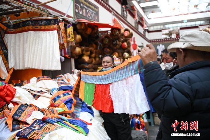 图为市民在八廓商城选购年货香布(藏式建筑门窗上装饰的五彩布料)。中新社记者 贡嘎来松 摄