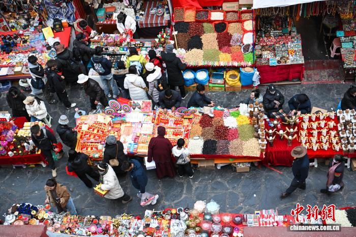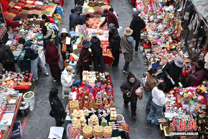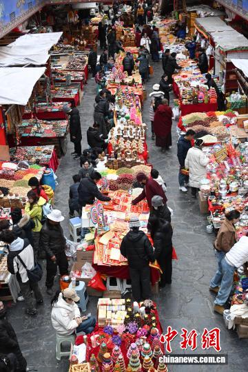 2月9日,随着春节、藏历新年临近,西藏拉萨市八廓商城等年货市场人头攒动。市民忙着挑选酥油花、香布、切玛盒等传统年货,市场内购销两旺、喜庆热闹,古城拉萨处处洋溢着浓厚的节日氛围。