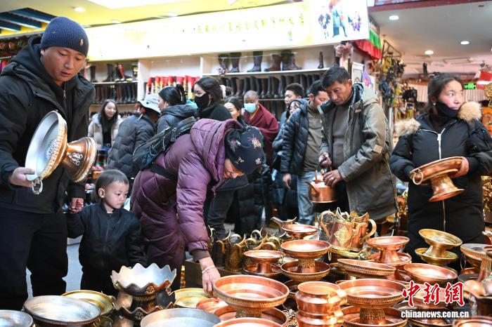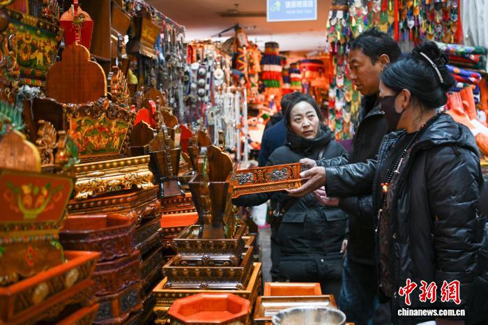 图为市民在八廓商城选购年货切玛盒。中新社记者 贡嘎来松 摄